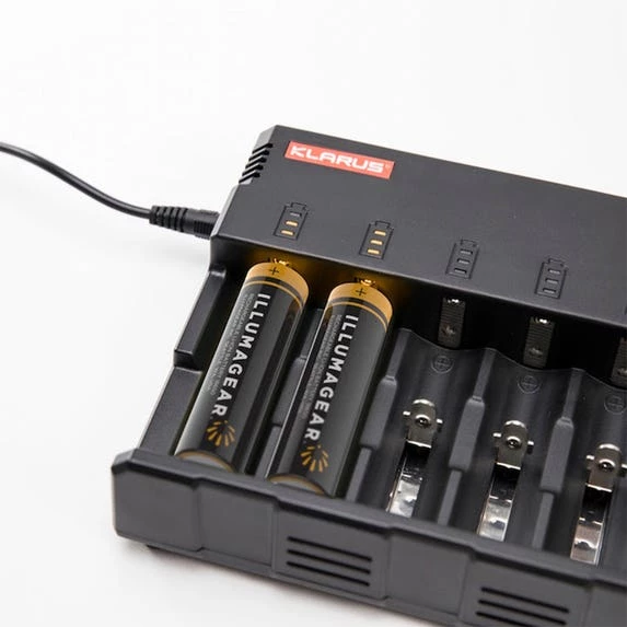 A universal charger capable of charging up to 8 Halo-compatible 18650 Lithium-Ion batteries from a standard electrical