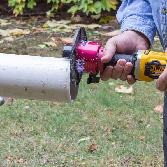 - Cordless tool deburrs and bevels plastic pipe quickly.